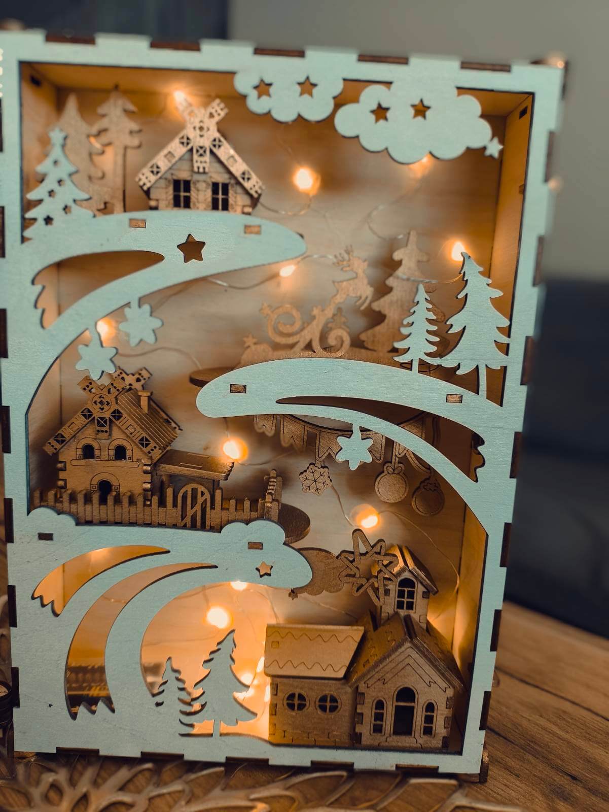 - Wyjątkowy Design: Kalendarz posiada piękne, misternie wycięte zimowe motywy, w tym domki, choinki i świąteczne ozdoby. Dzięki podświetleniu LED cały krajobraz ożywa i tworzy przytulny, ciepły blask, który rozświetli każde wnętrze.