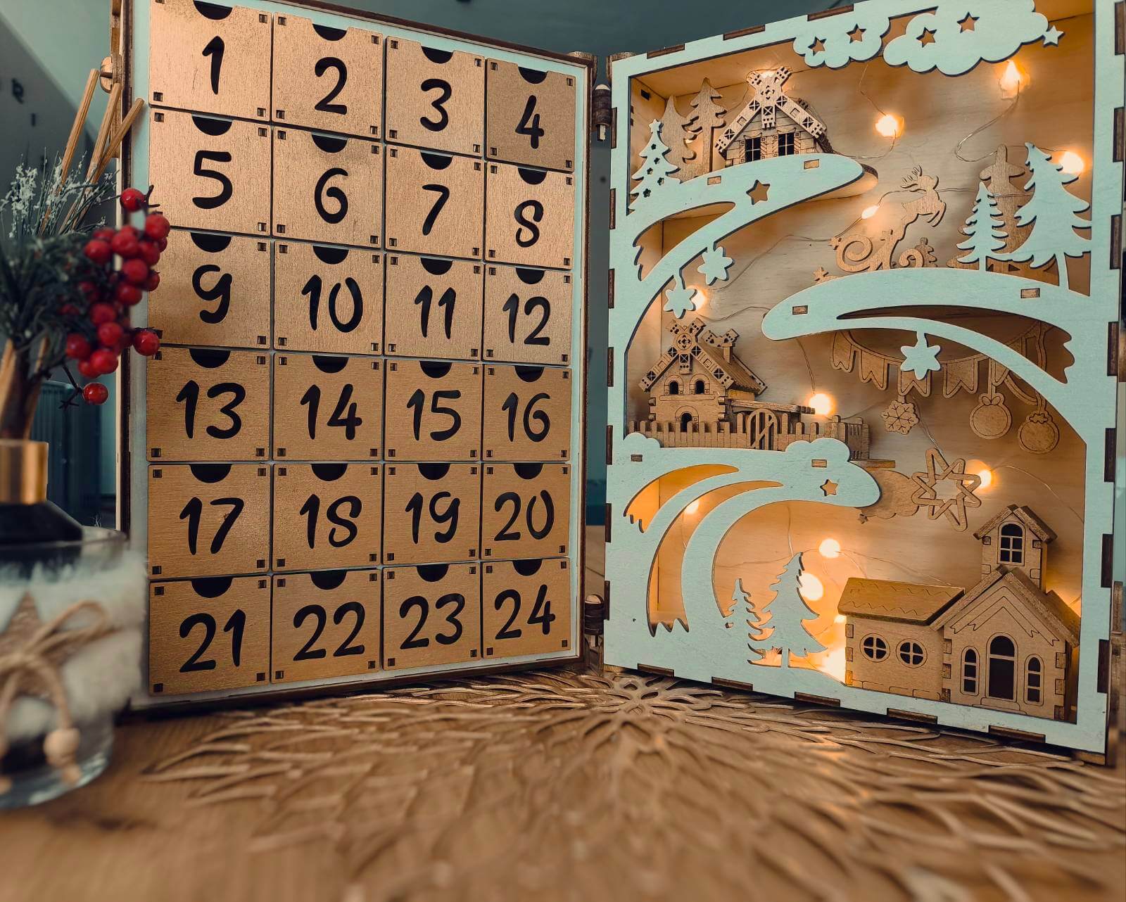 Stwórz magiczny klimat oczekiwania na Święta dzięki unikalnemu, drewnianemu kalendarzowi adwentowemu z podświetleniem LED! To pięknie wykonane rękodzieło nie tylko wprowadzi świąteczny nastrój do Twojego domu, ale także pozwoli na odliczanie dni do Gwiazdki w wyjątkowym stylu.